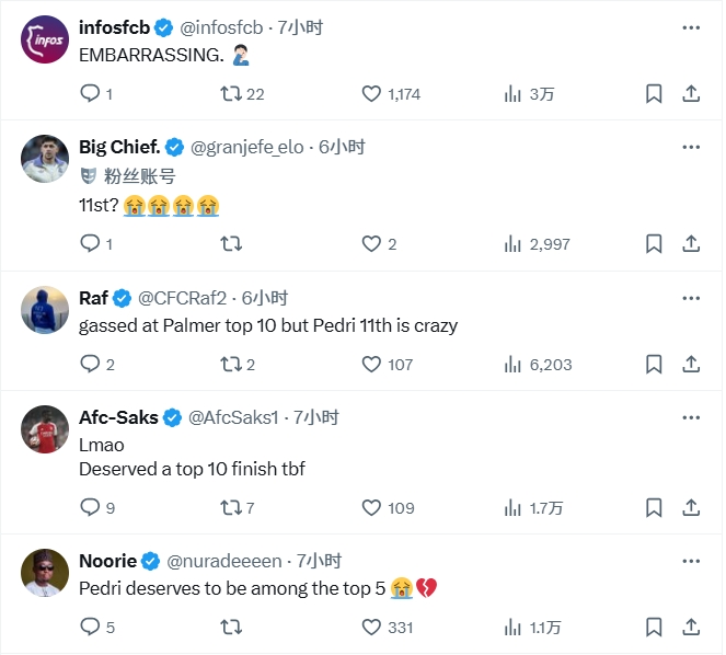 “他们竟然将帕尔默排在佩德里之前,真是耻辱!!”