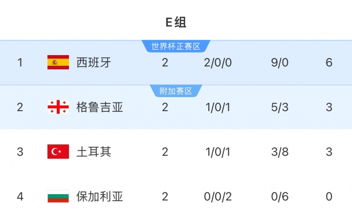 西班牙国家队将于10月中旬在世预赛中对阵格鲁吉亚和保加利亚,目前西班牙积6分位列E组第一,领先格鲁吉亚3分。