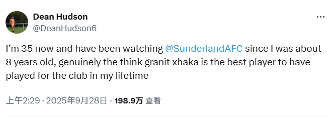 英超升班马桑德兰本赛季开局表现出色, 6轮仅1负目前排名前5。球队新援、队长扎卡的出色表现引发了一位23年桑德兰本土老球迷的赞叹。