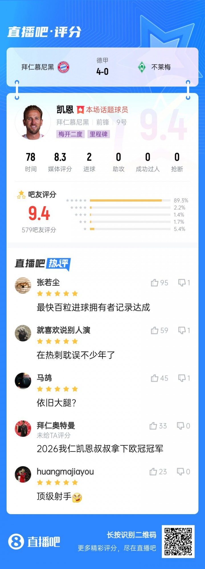 第五轮评选结果结出炉,凯恩梅开二度斩获个人拜仁百球,帮助拜仁4-0击败不莱梅,获得吧友4万多票支持,当选【乐球科技X小红书德甲第5轮最佳球员】!