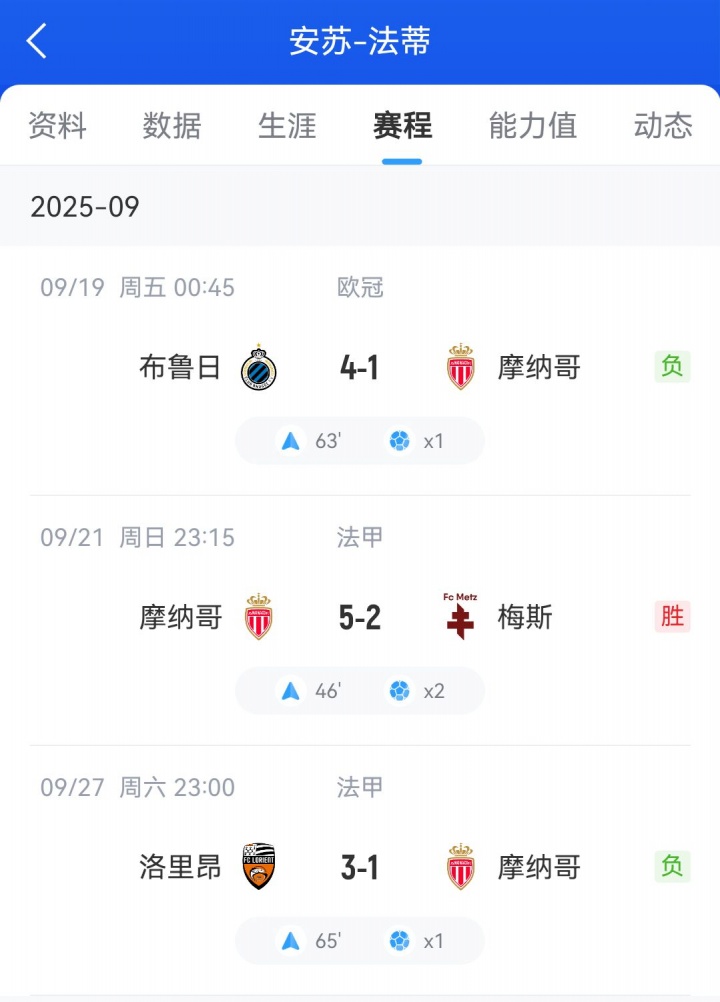 目前,法蒂已经为摩纳哥出战3场比赛(均为替补登场),并在为数不多的上场时间中打进了4个进球。