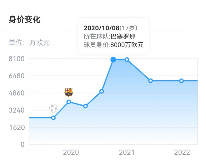 他在2020年达到了个人巅峰身价8000万欧元,但随后受困于连续伤病,身价一路走低,目前仅剩500万欧。