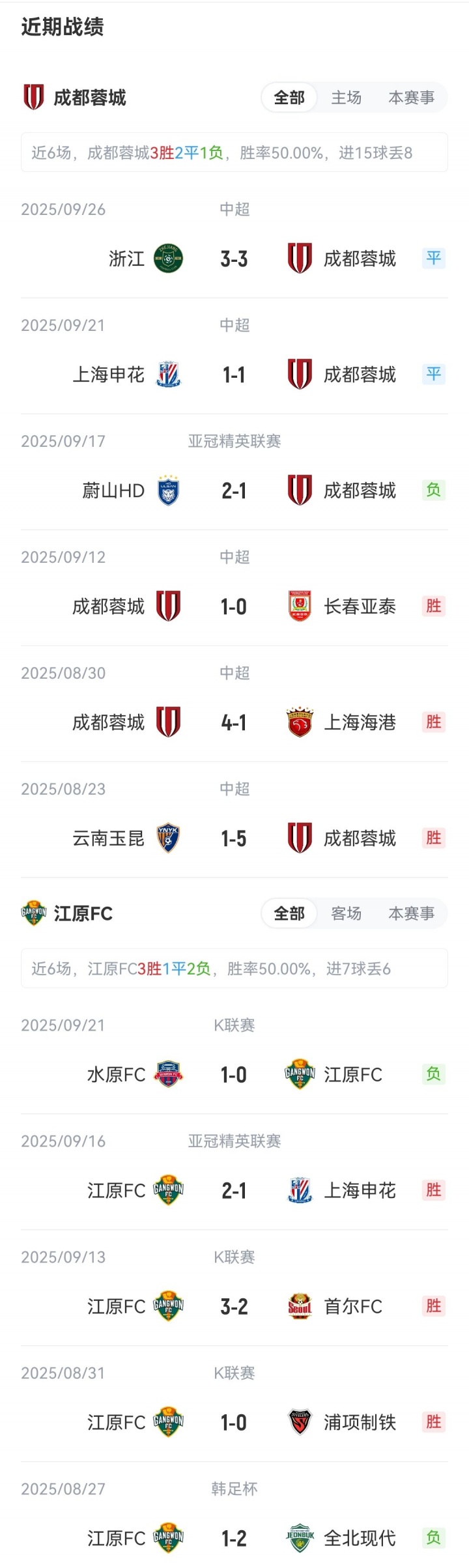 本场比赛是成都蓉城首个亚冠正赛主场。蓉城首轮客场不敌蔚山HD,暂排名亚冠第8;江原FC主场2-1战胜上海申花,积3分排名亚冠第4。