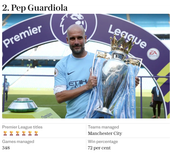 乐球科技09月30日讯 近日,英媒《电讯报》评选了英超历史十大主帅,其中弗格森第一,瓜迪奥拉第二,温格、穆里尼奥分列三四。