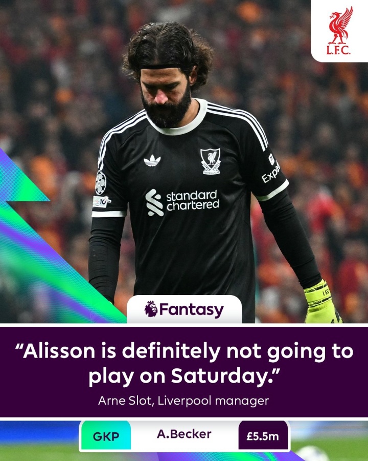 乐球科技10月01日讯 利物浦本轮欧冠0-1不敌加拉塔萨雷,更糟糕的是阿利森、埃基蒂克先后伤退,主帅斯洛特赛后也坦言,阿利森本周英超将无法出战。
