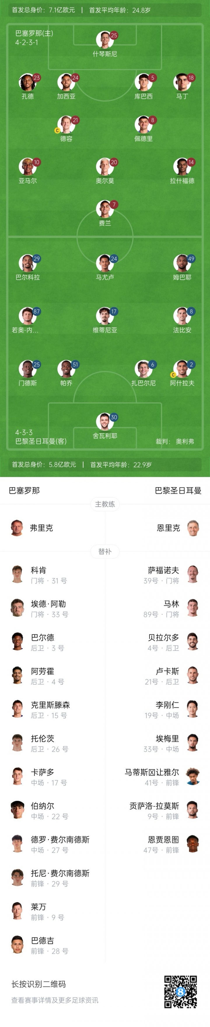 巴萨首发:25-什琴斯尼、5-库巴西、18-赫拉德·马丁、23-孔德、24-埃里克·加西亚、8-佩德里、20-奥尔莫、21-德容、14-拉什福德、10-亚马尔、7-费兰