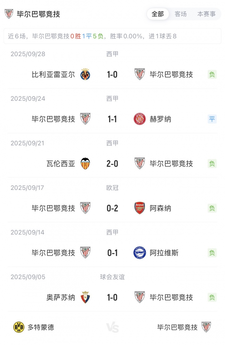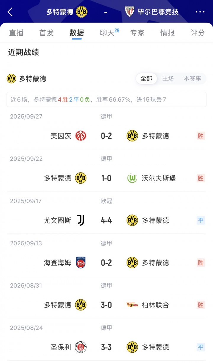 多特蒙德上一轮欧冠,客场4-4战平尤文图斯;毕尔巴鄂竞技上一轮欧冠,主场0-2不敌阿森纳!