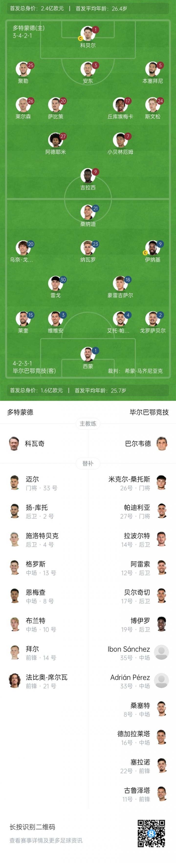 多特首发:1-科贝尔、3-安东、5-本塞拜尼、24-斯文松、25-聚勒、26-莱尔森、7-小贝林厄姆、17-丘库埃梅卡、20-萨比策、9-吉拉西、27-阿德耶米
