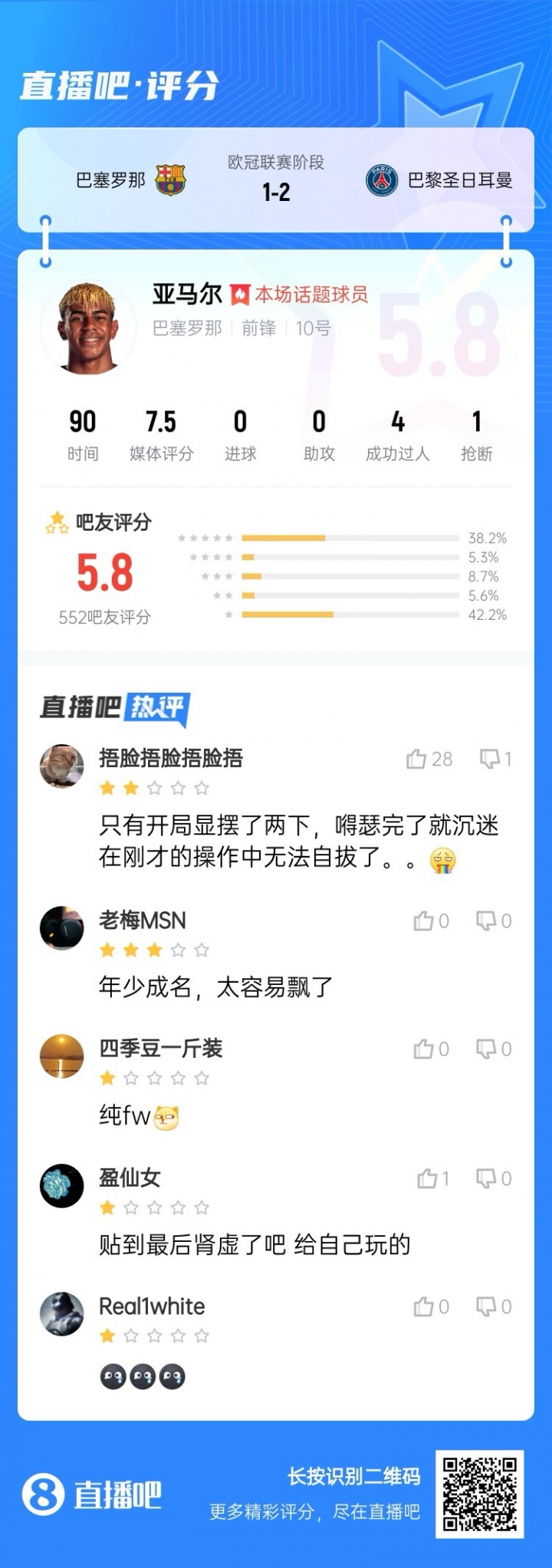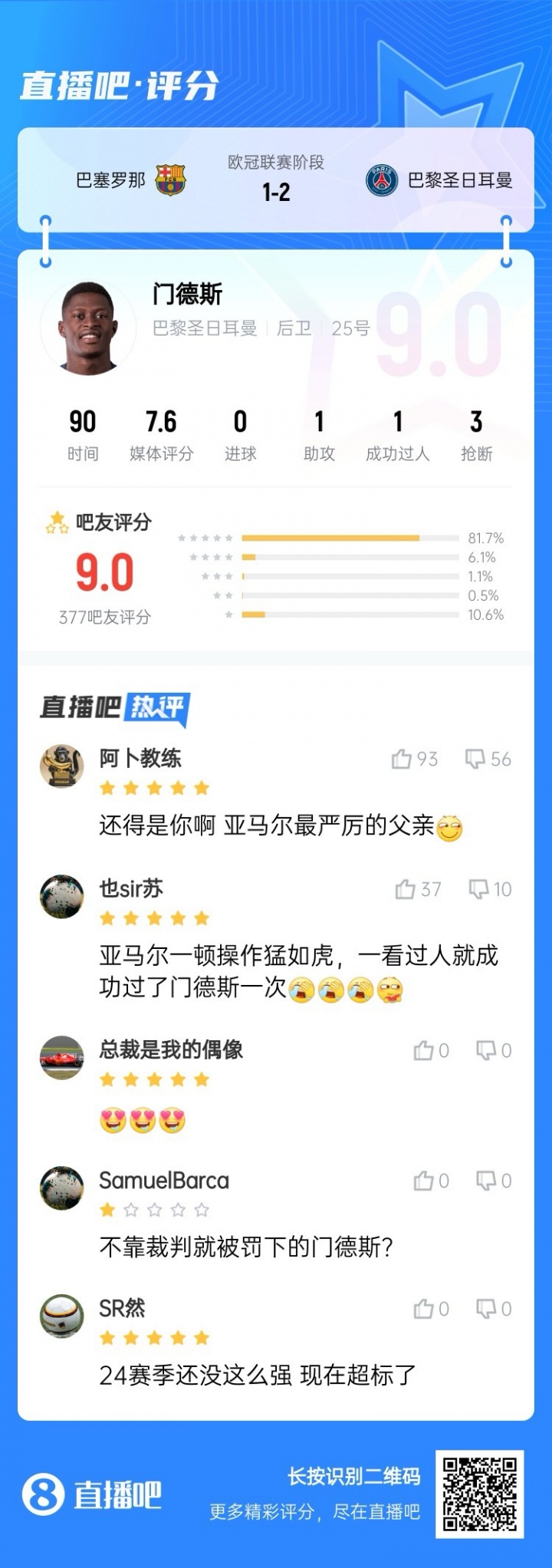 乐球科技10月02日讯 欧冠联赛阶段第2轮巴萨1-2巴黎,赛前阿什拉夫在新闻发布会上曾表示:“亚马尔面对的是世界最佳左后卫努诺-门德斯。门德斯有能力像限制其他类似攻击手那样防住亚马尔。” 吧友们认为门德斯本场是否限制了亚马尔的发挥?