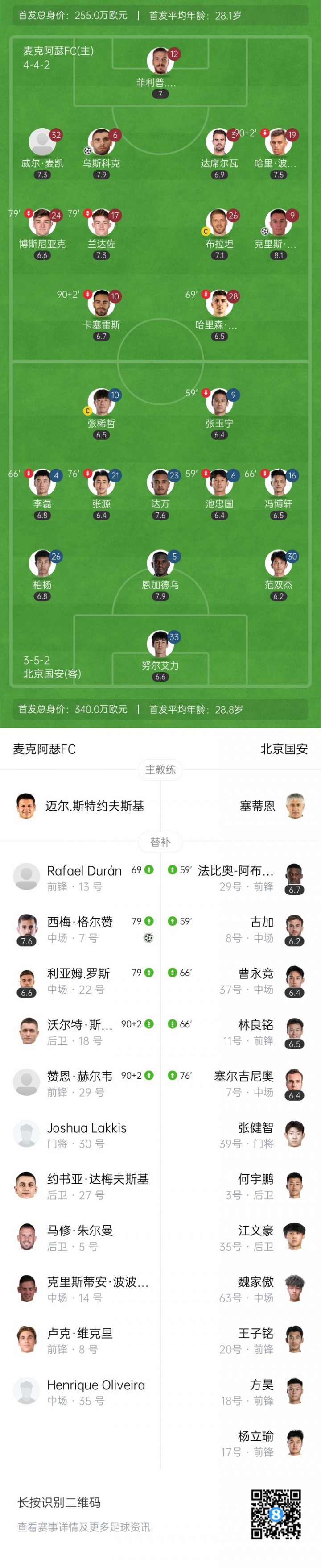 本场国安首发轮换了大半支球队,0-2落后时才换上法比奥、古加、林良铭、曹永竞,第76分钟换上塞鸟,但仍然无力回天。