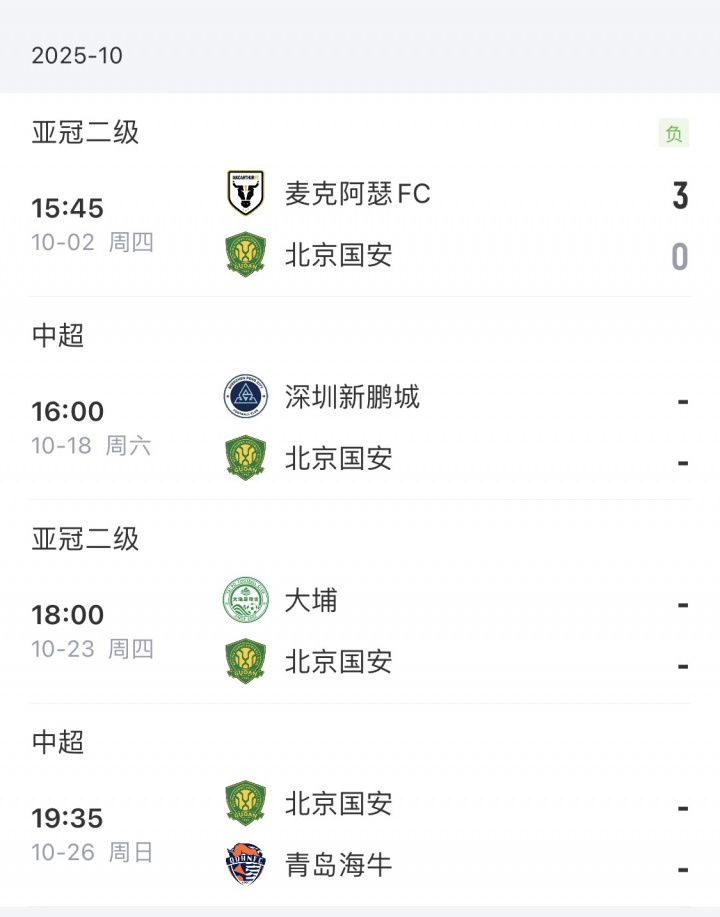 北京国安下一场中超比赛要到10月18日客战深圳新鹏城。