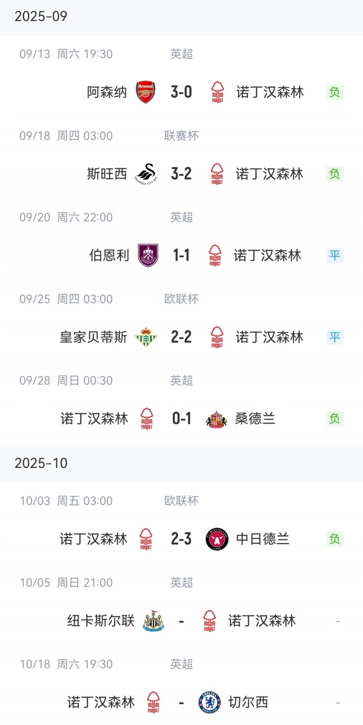 森林周末将联赛对阵纽卡,国际比赛日结束后又将对阵切尔西。