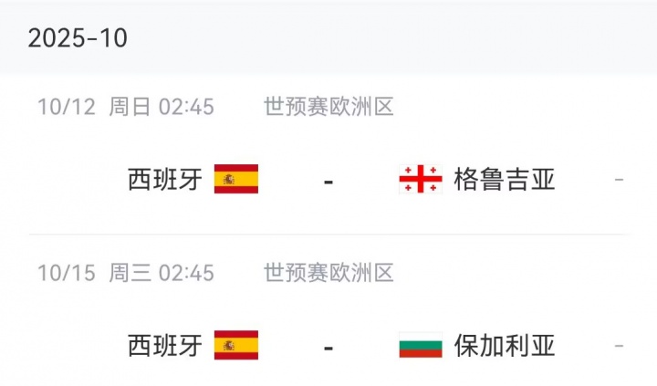 西班牙本月将进行两场世预赛欧洲区比赛:10月12日主场迎战格鲁吉亚,10月15日迎战保加利亚。目前西班牙在世预赛欧洲区E组2战全胜排名第1。
