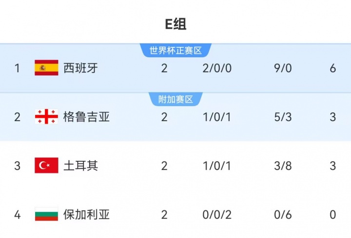 世预赛欧洲区E组积分榜↓